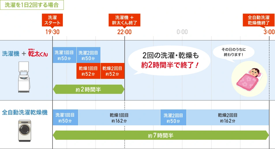 乾太くんは、電気式乾燥機と比べて乾燥時間が非常に短く、効率よく衣類を乾かせる点が特徴です。そのため、使用条件によってはトータルのランニングコストを抑えられる可能性があります。